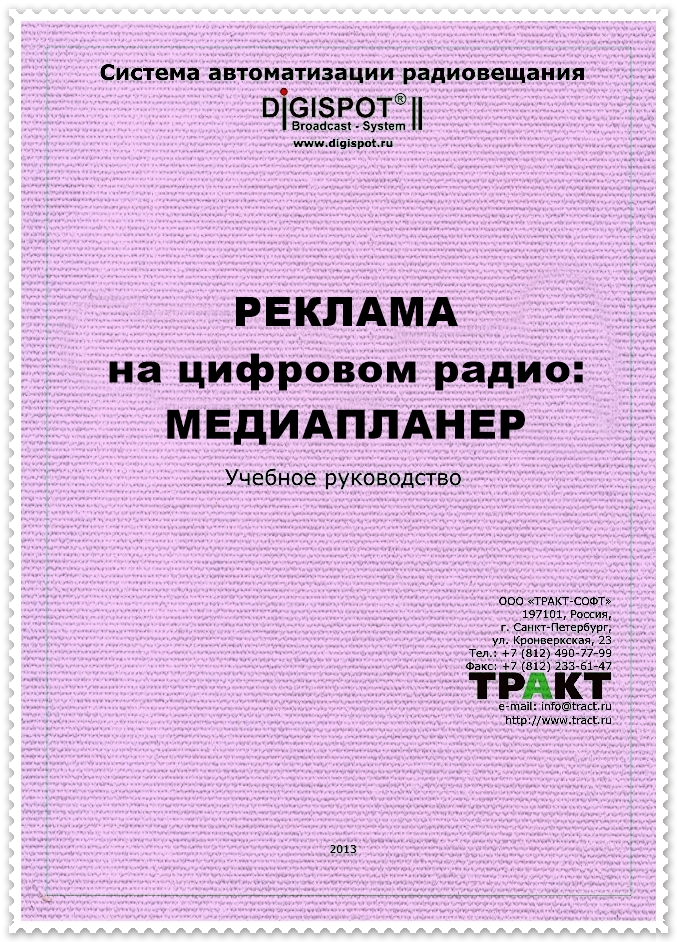 Программный продукт DIGISPOT II Медиапланер создан для оптимизации работы отдела продаж цифровой радиостанции (радиосети) и помощи трафик-менеджеру при размещении рекламы в эфире. Основные возможности программы: • создание медиапланов для проката рекламных роликов и расчёт их стоимости; • формирование и ведение клиентской базы; • создание и заполнение рекламного расписания; • импорт рекламного расписания в вещательное расписание станции; • контроль выходов рекламы в эфир; • формирование отчётов и эфирных справок по итогам рекламных кампаний. Кроме того, программа позволяет выгружать данные рекламного планирования для бухгалтерии. Учебное руководство предназначено для сотрудников отдела продаж, трафик-менеджеров, программных директоров и выпускающих редакторов радиокомпаний.